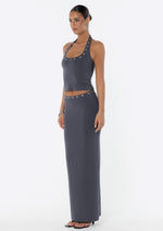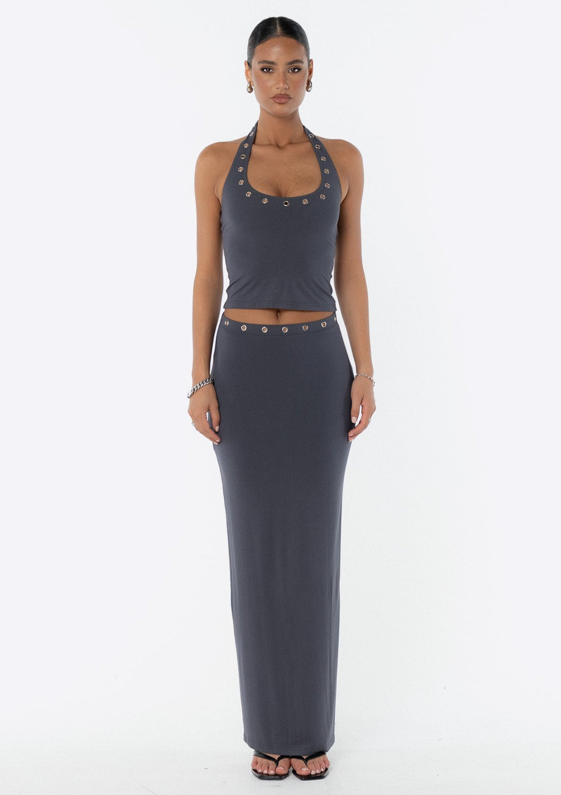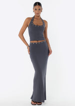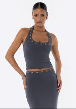 Introducing the JGR & STN Zali Halter Top. Made from a soft modal fabric featuring eyelet details around the neckline. Pairs perfectly with the Zali Maxi Skirt.
