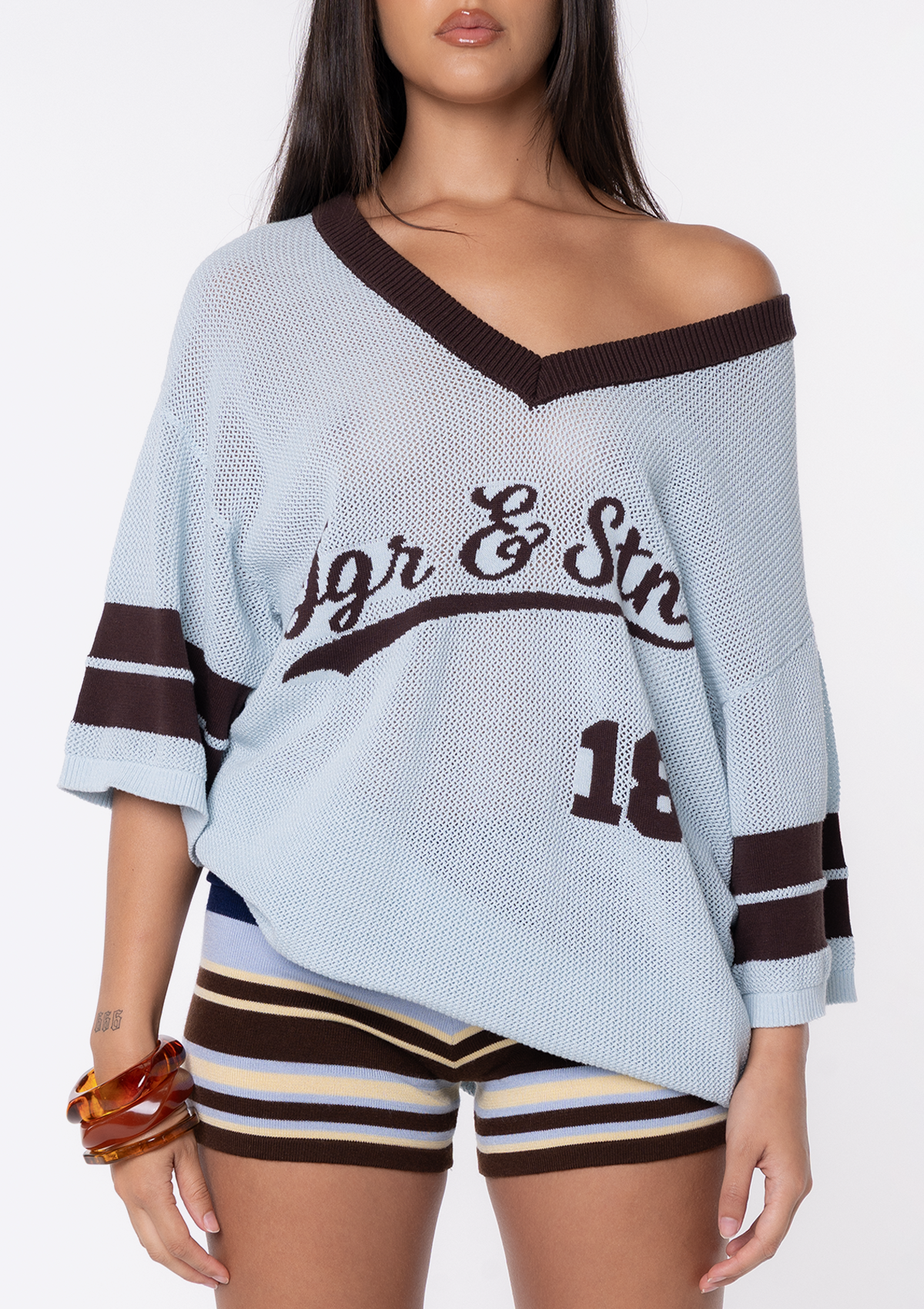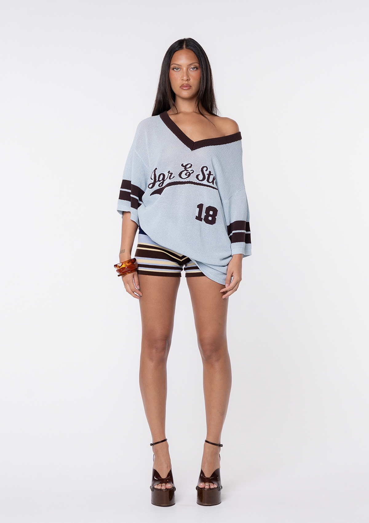 Introducing the JGR & STN Katie Knit Jersey. Crafted in a breathable, soft knit fabric with an engineered front print. Pairs with our Katie Knit Shorts.