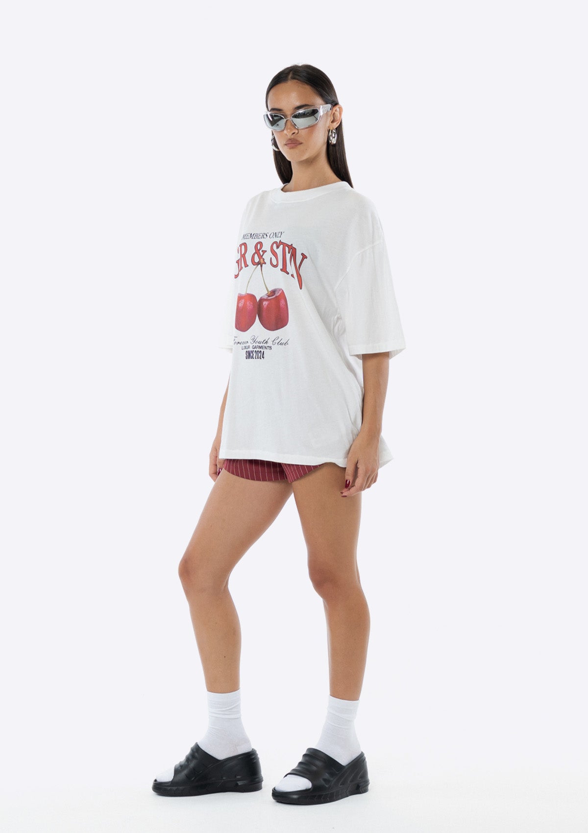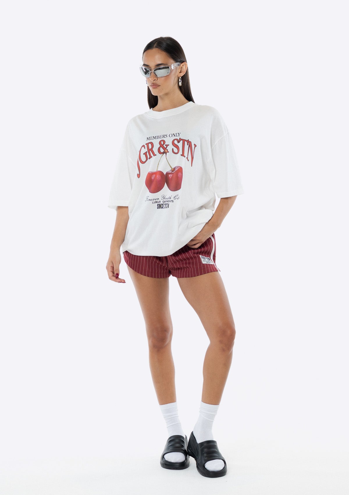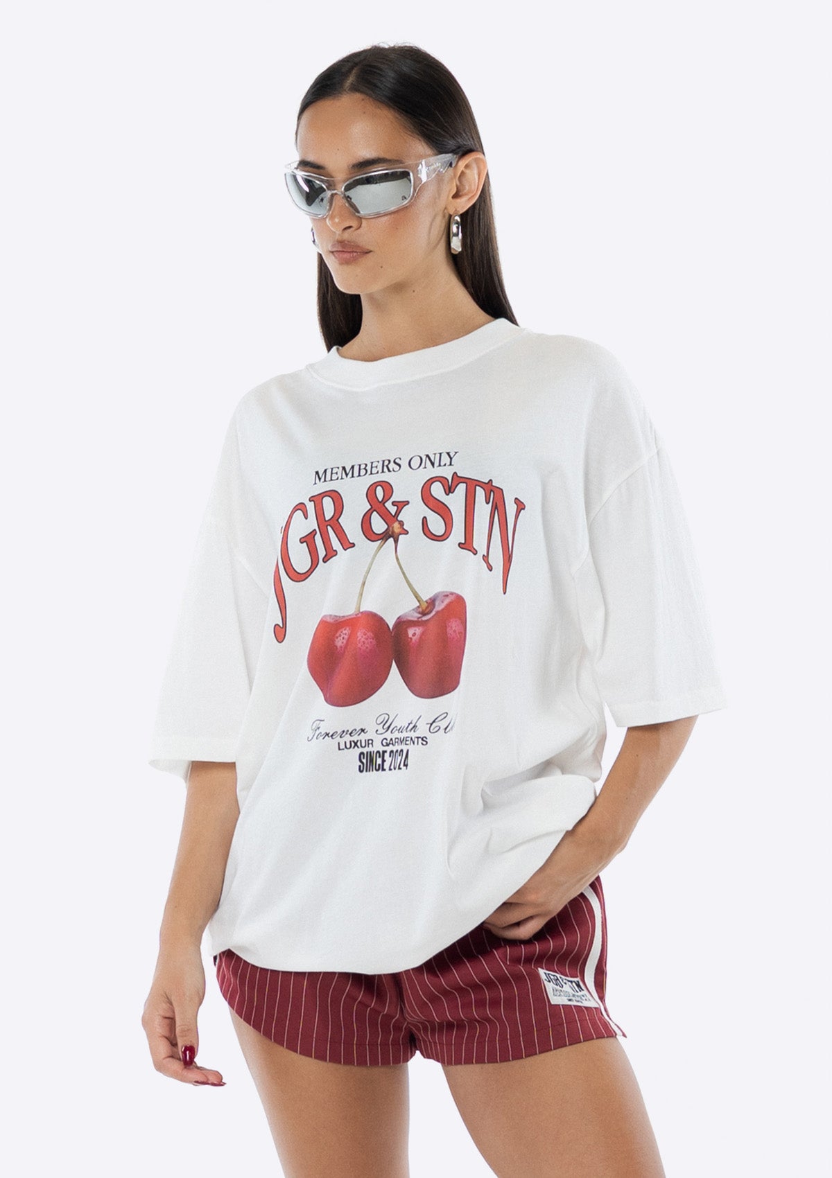 Introducing the JGR & STN Cherry Oversized Tee. Crafted in a soft, vintage-feel fabric and featuring printed graphics on the front.