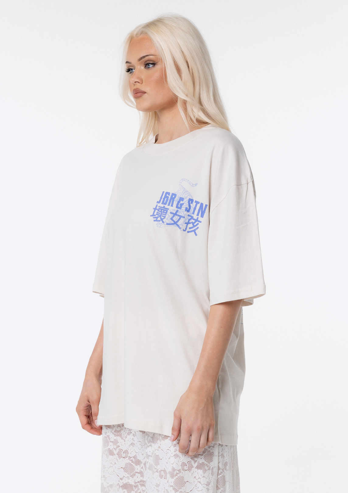 Introducing the JGR & STN Dee Oversized Tee. Crafted in a soft, vintage-feel fabric and featuring printed graphics on the front and back.