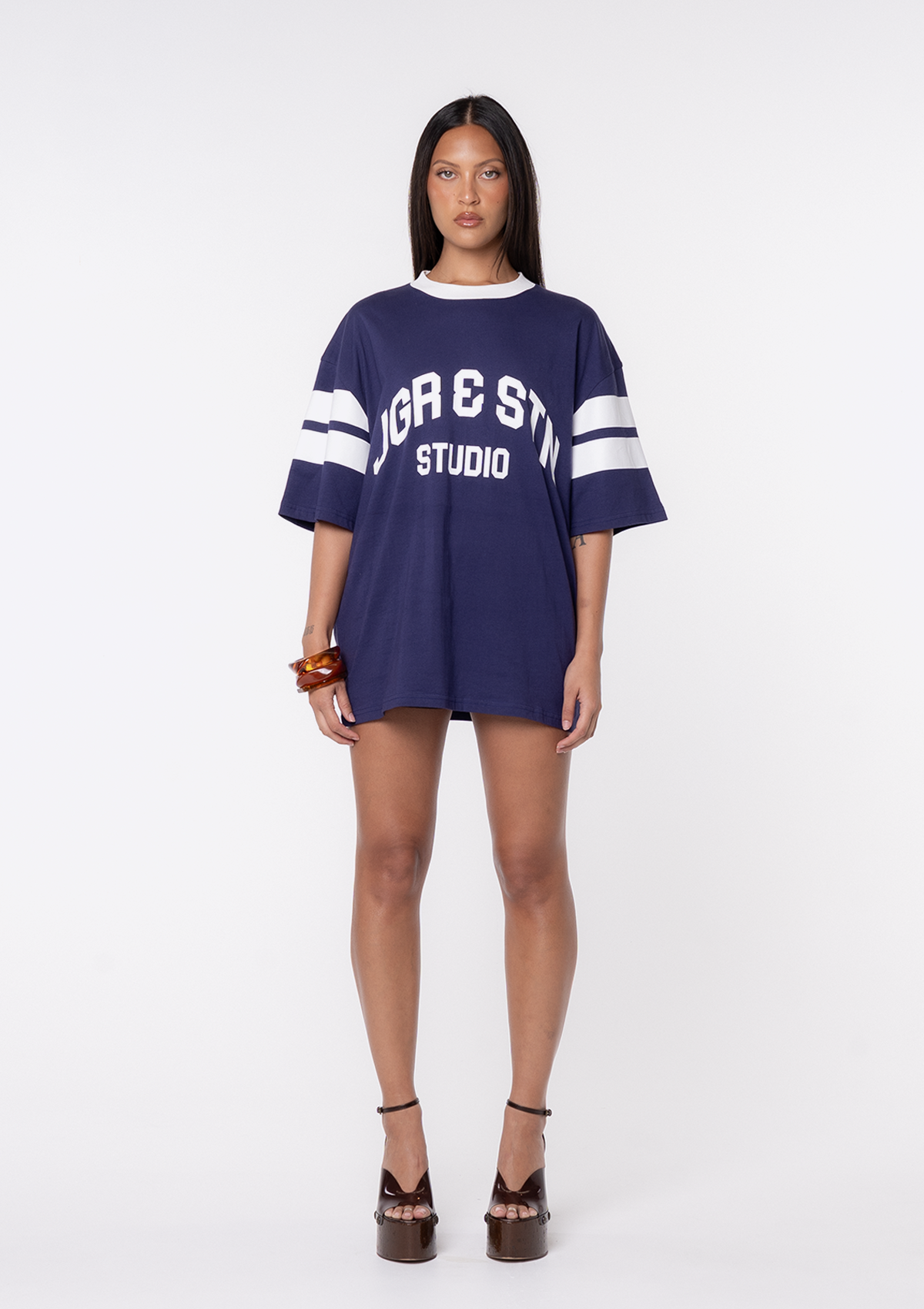 Introducing the JGR & STN Studio Oversized Tee. Inspired by our favourite vintage sports jerseys. Featuring printed branding on the chest and a double stripe on the sleeves.